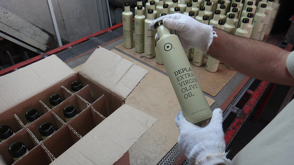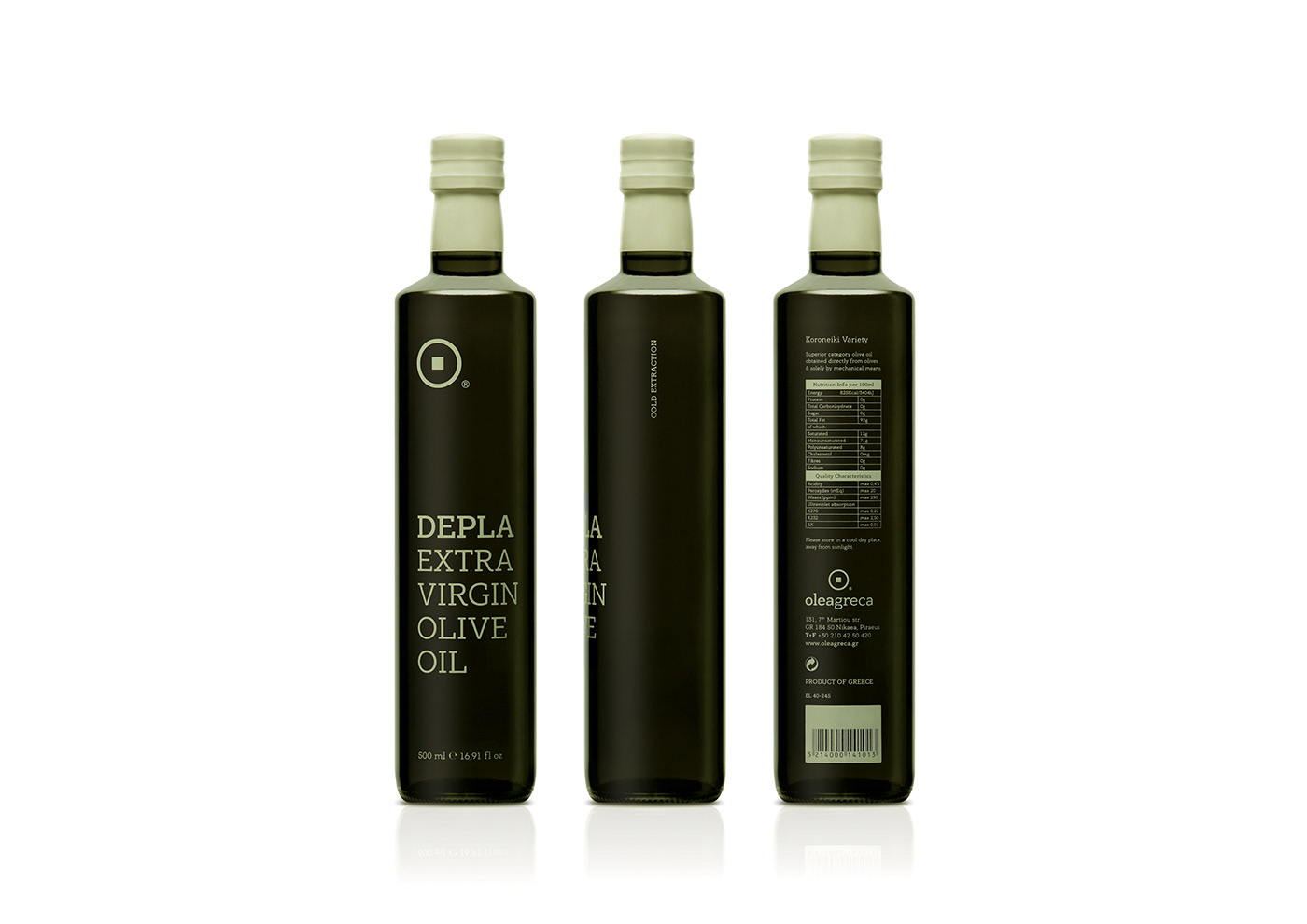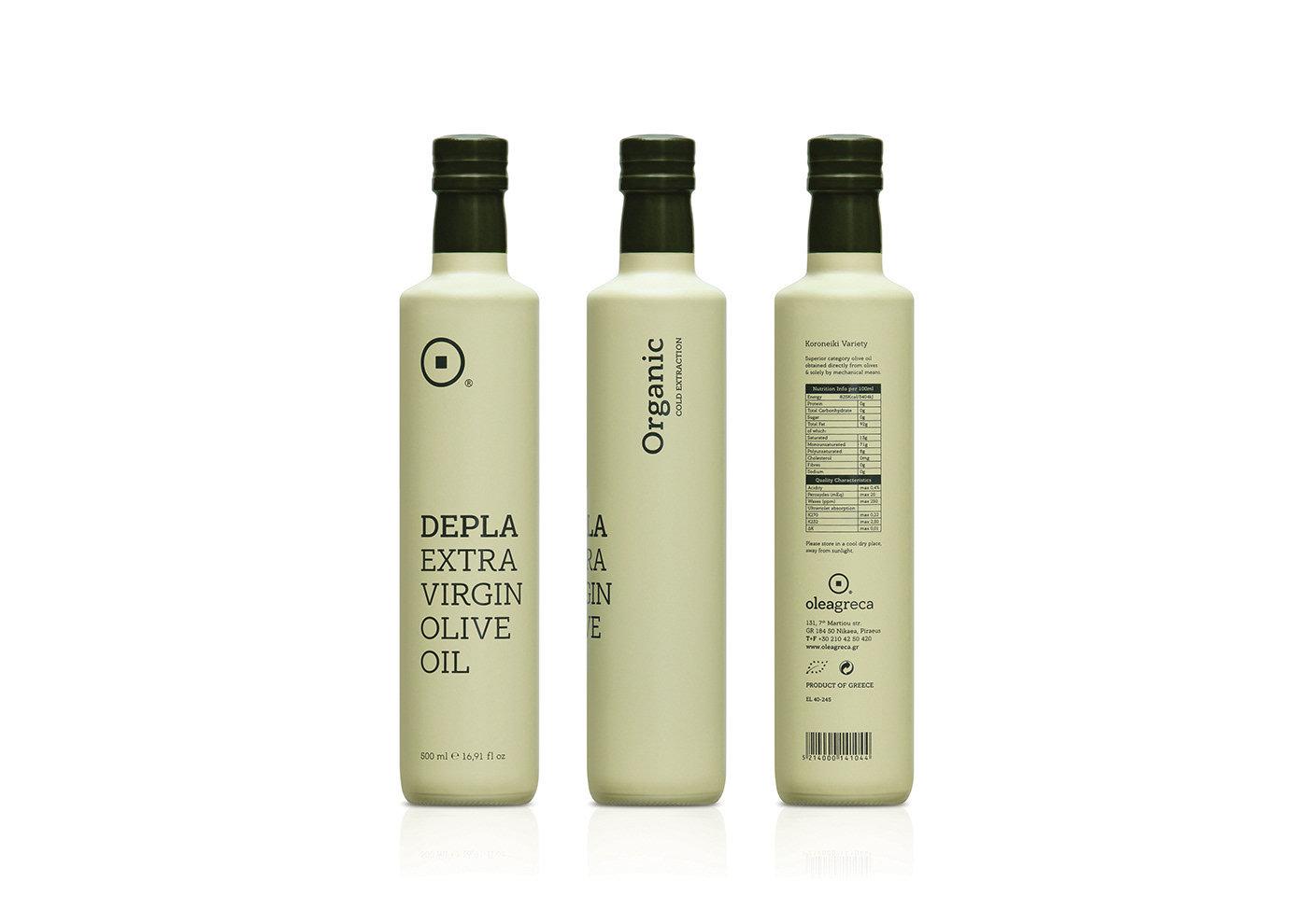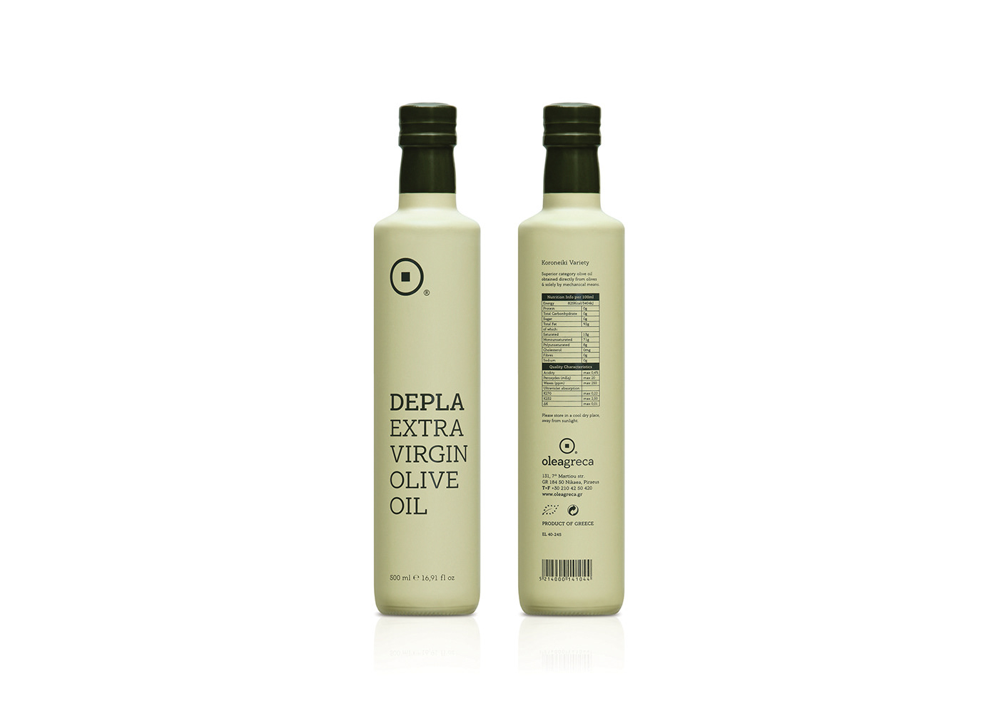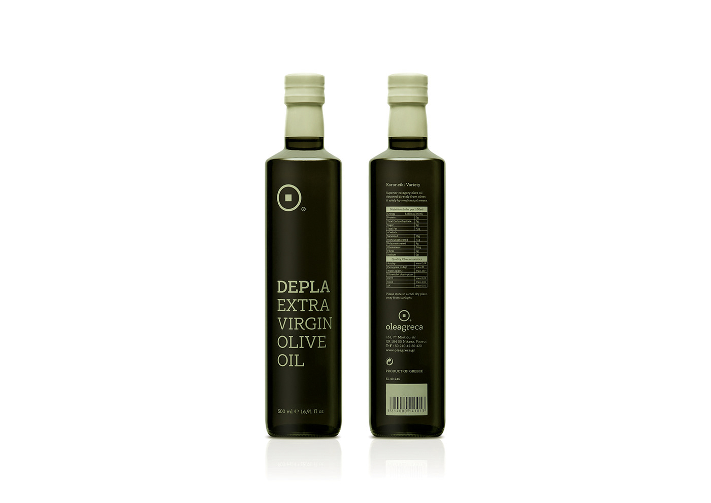 Το ελαιόλαδο της εταιρίας Oleagreca ονομάστηκε Depla, από το χαρακτηριστικό ραβδί (δέπλα), με το οποίο χτυπούν τα κλαδιά του δέντρου κατά τη συγκομιδή της ελιάς. Το προϊόν παράγεται σε δύο κατηγορίες: Depla Extra Virgin Olive Oil και Depla Organic Extra Virgin Olive Oil και διατίθεται σε τρία διαφορετικά μεγέθη (750, 500 & 250ml). Η χρωματική παλέτα των δύο συσκευασιών είναι εμπνευσμένη από τις δύο αποχρώσεις του φύλλου της ελιάς στο εμπρός και στο πίσω μέρος, αντίστοιχα.
