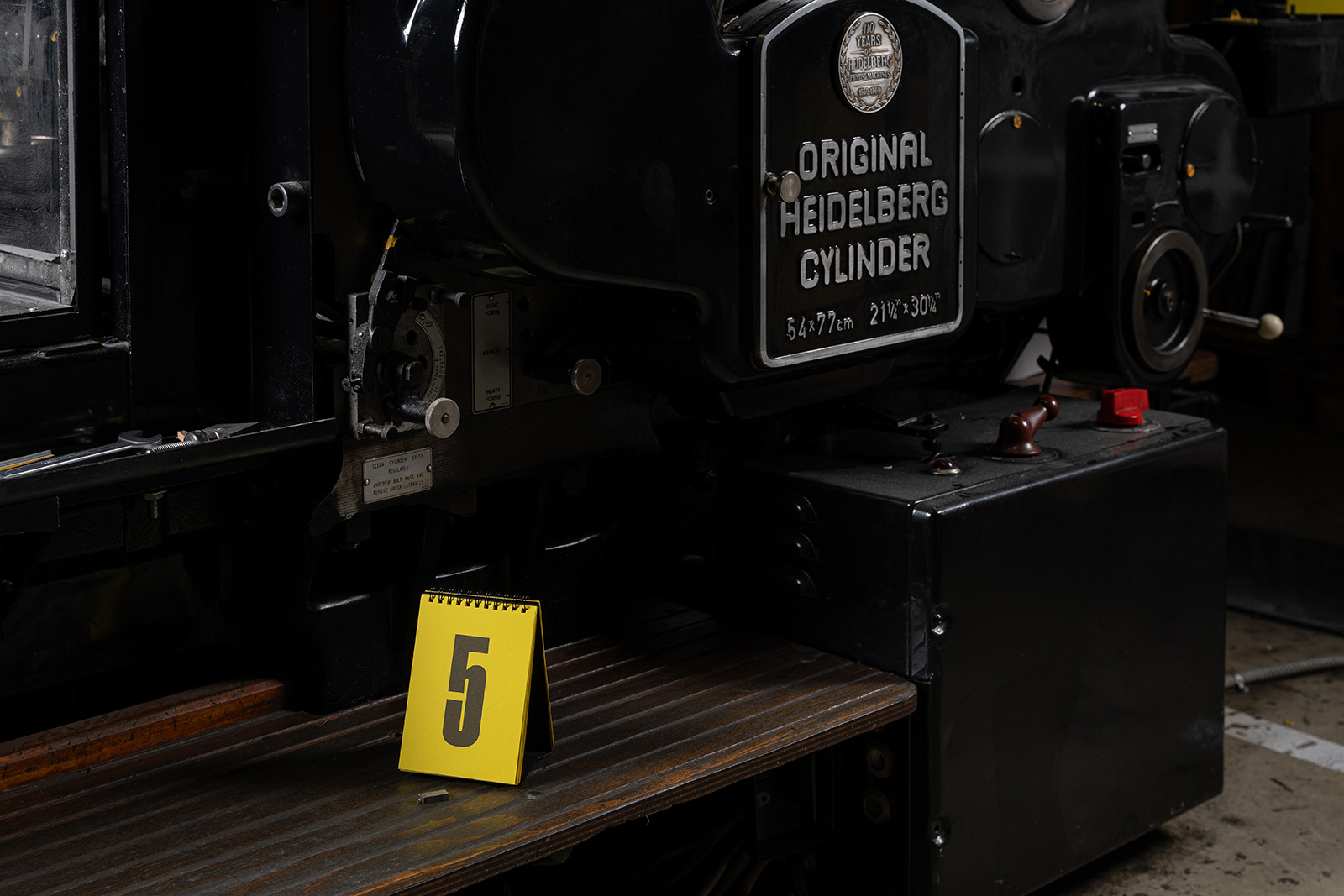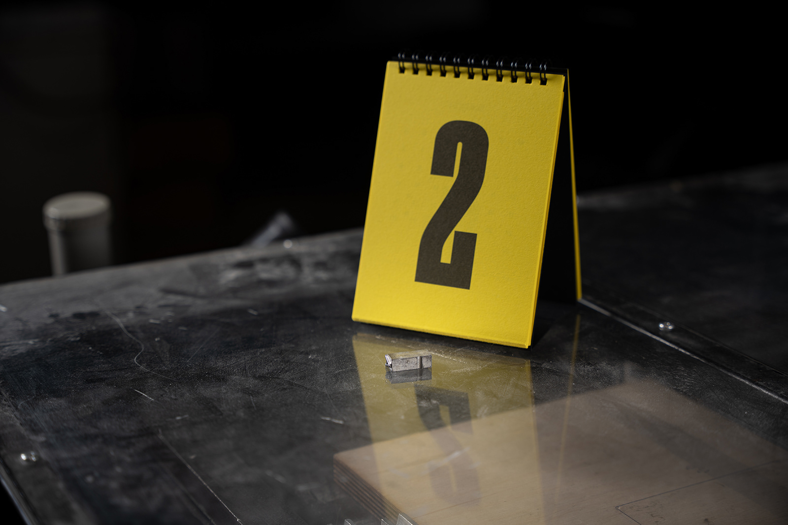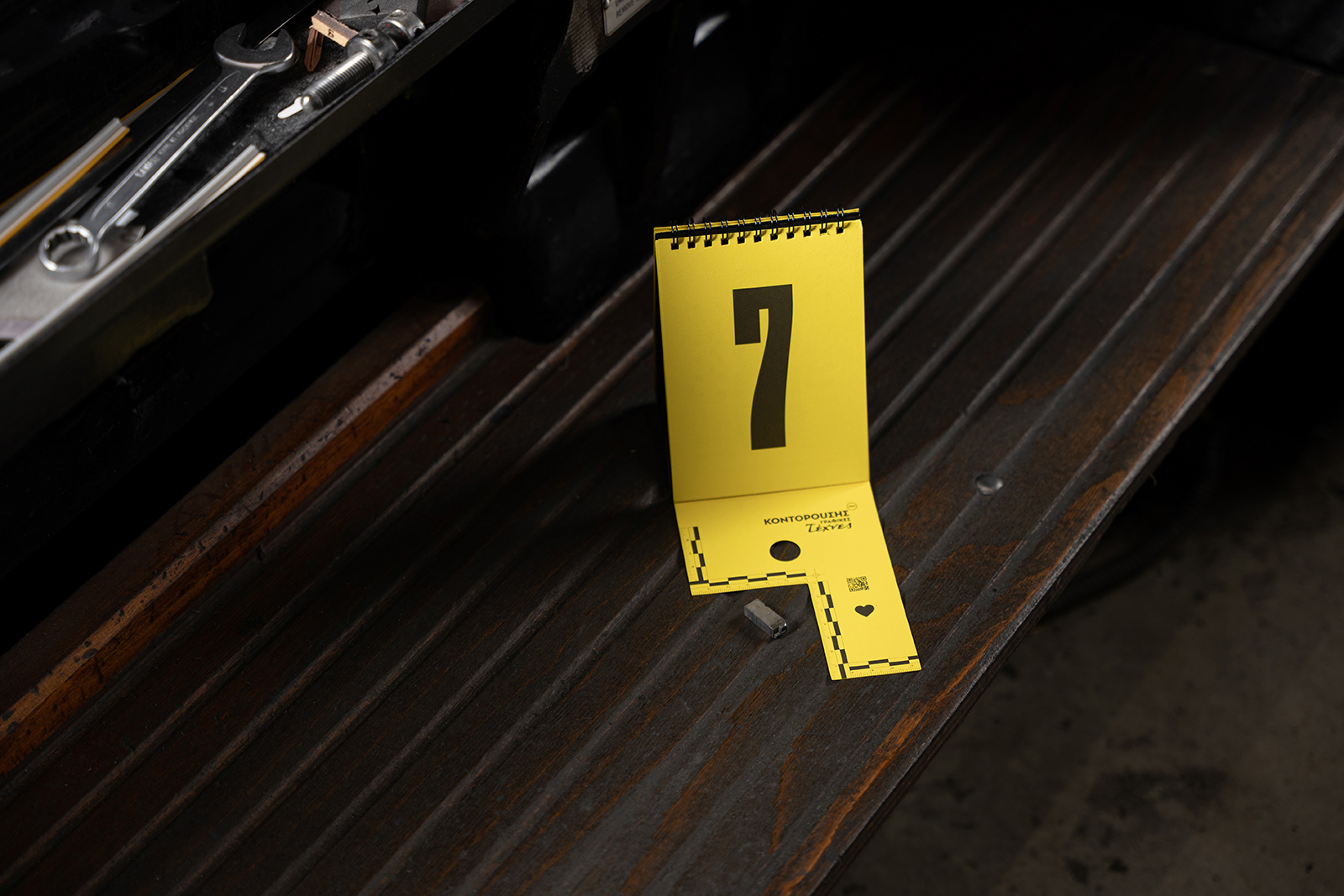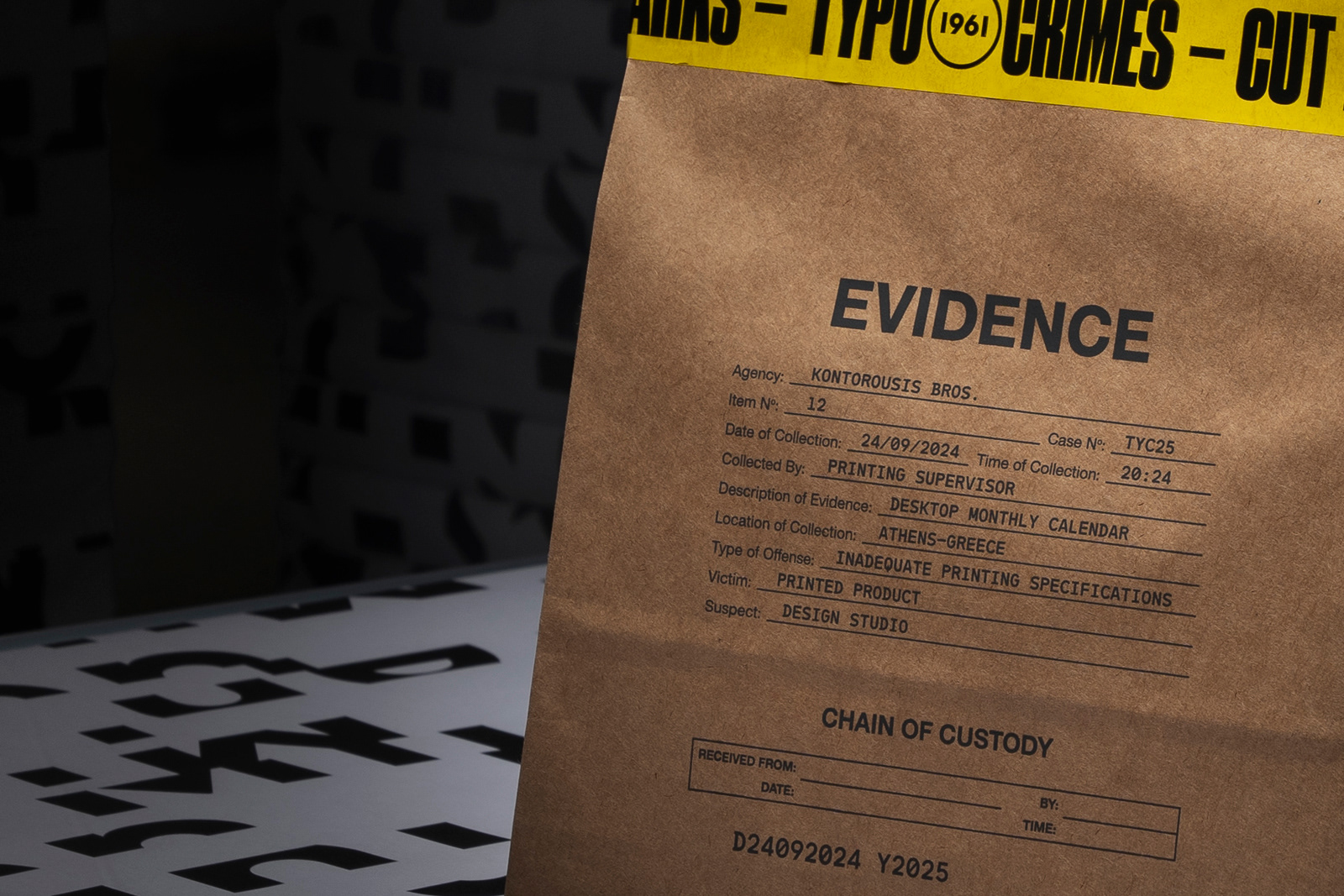 The source of inspiration for the design of the calendar was the common “crimes” that occur during the printing process. The shape and color of the calendar are a reference to the signage used by forensic teams in crime scenes, and the specialized numbered markers next to the findings.