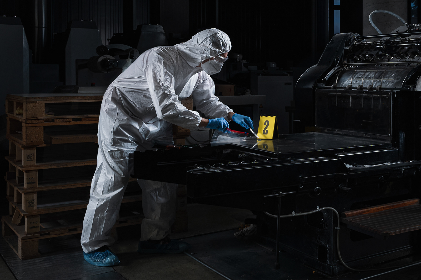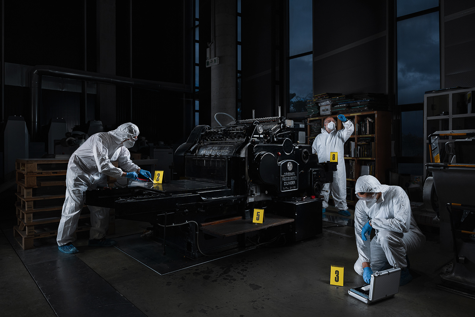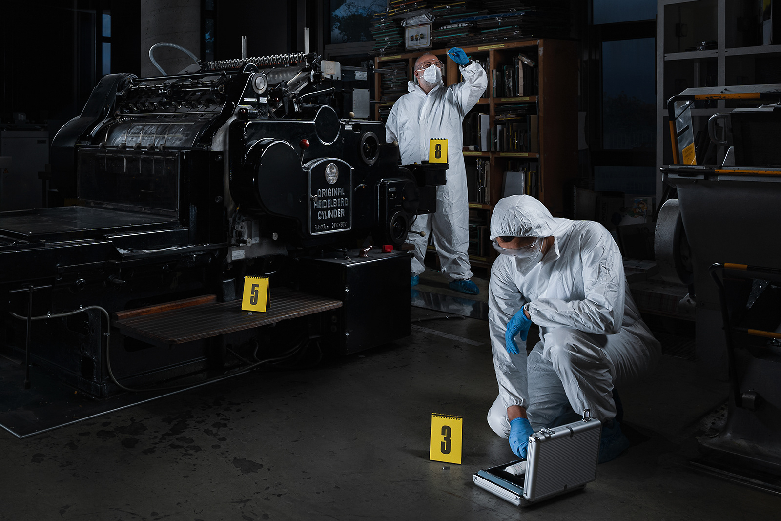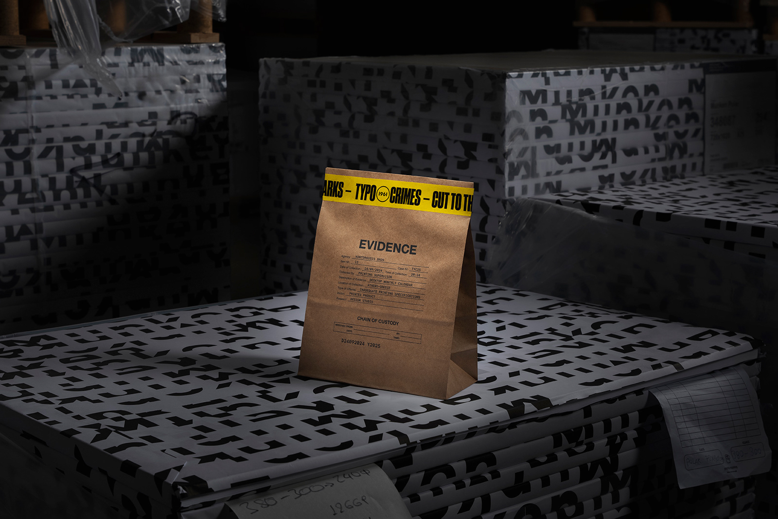 The source of inspiration for the design of the calendar was the common “crimes” that occur during the printing process. The shape and color of the calendar are a reference to the signage used by forensic teams in crime scenes, and the specialized numbered markers next to the findings.