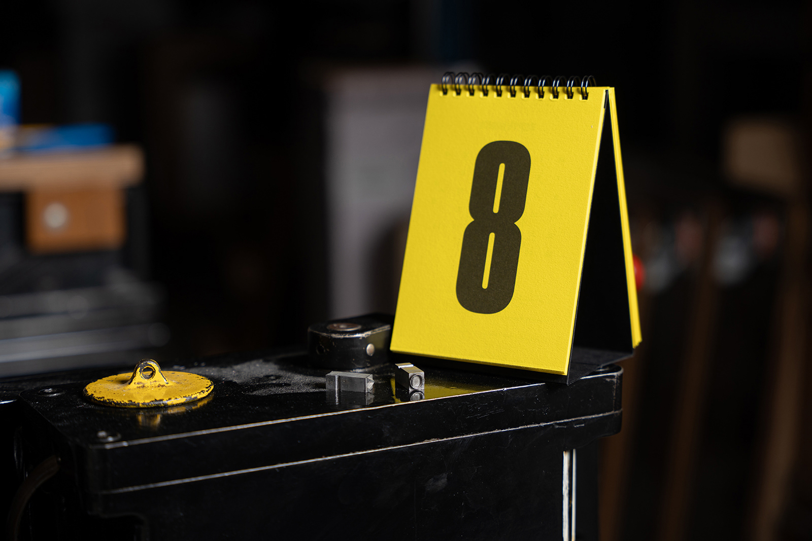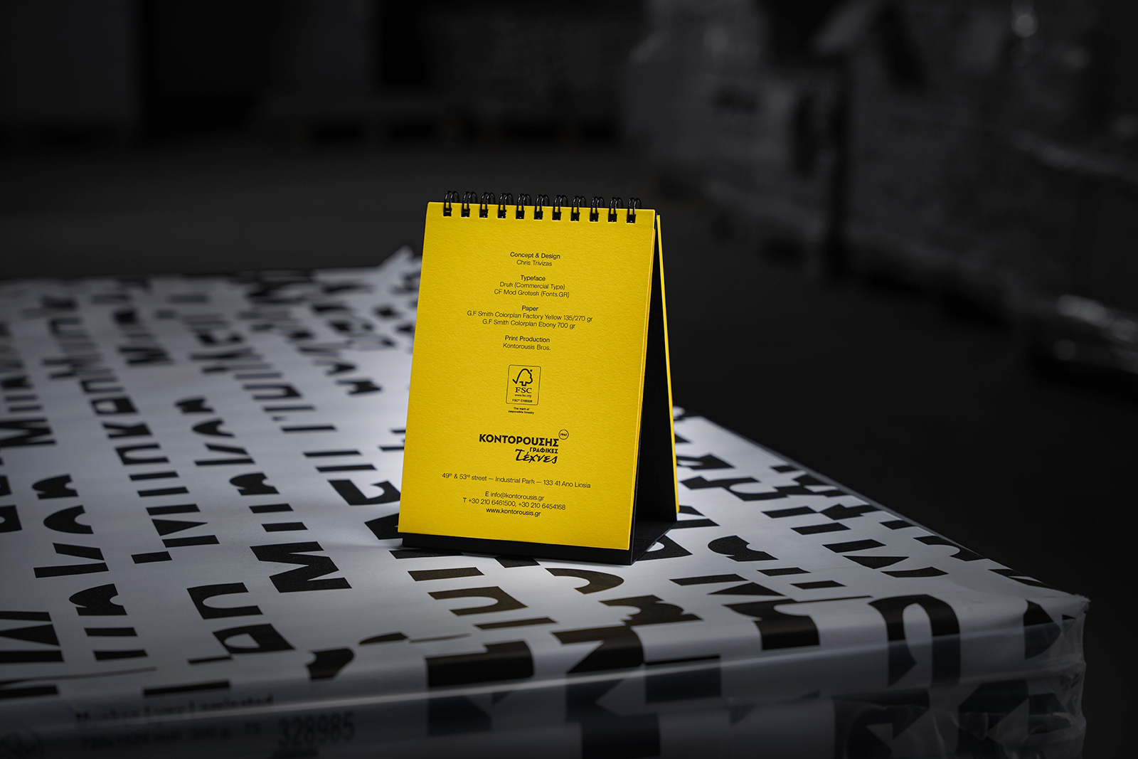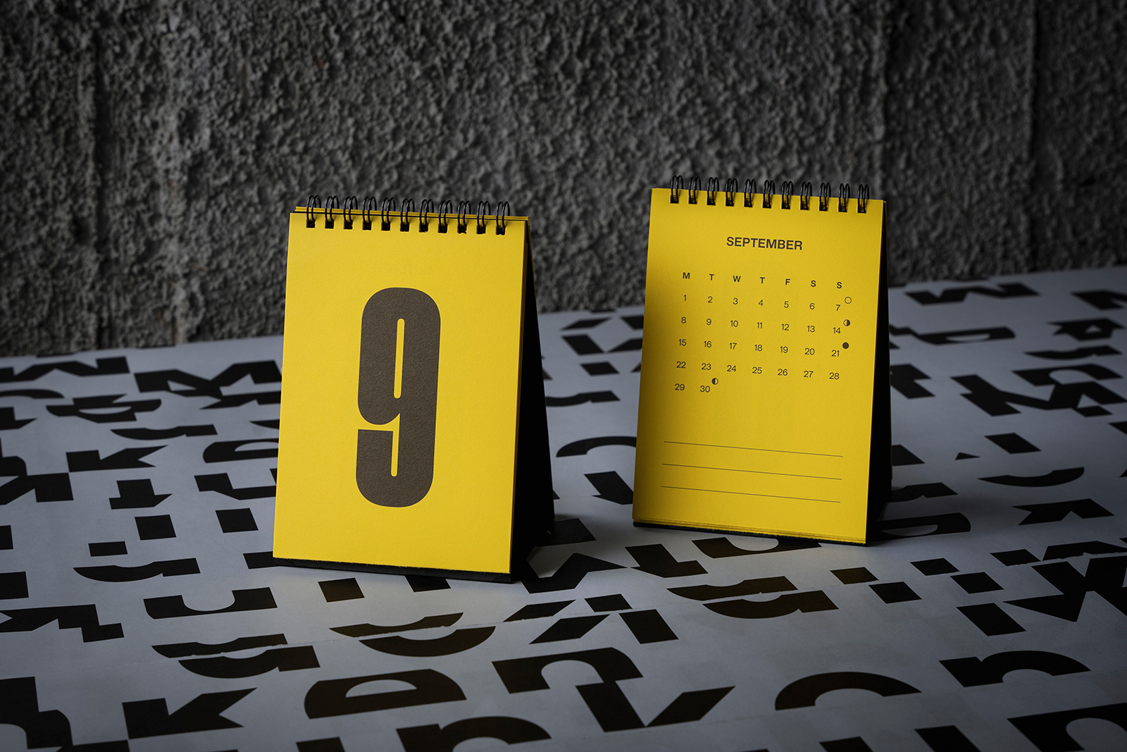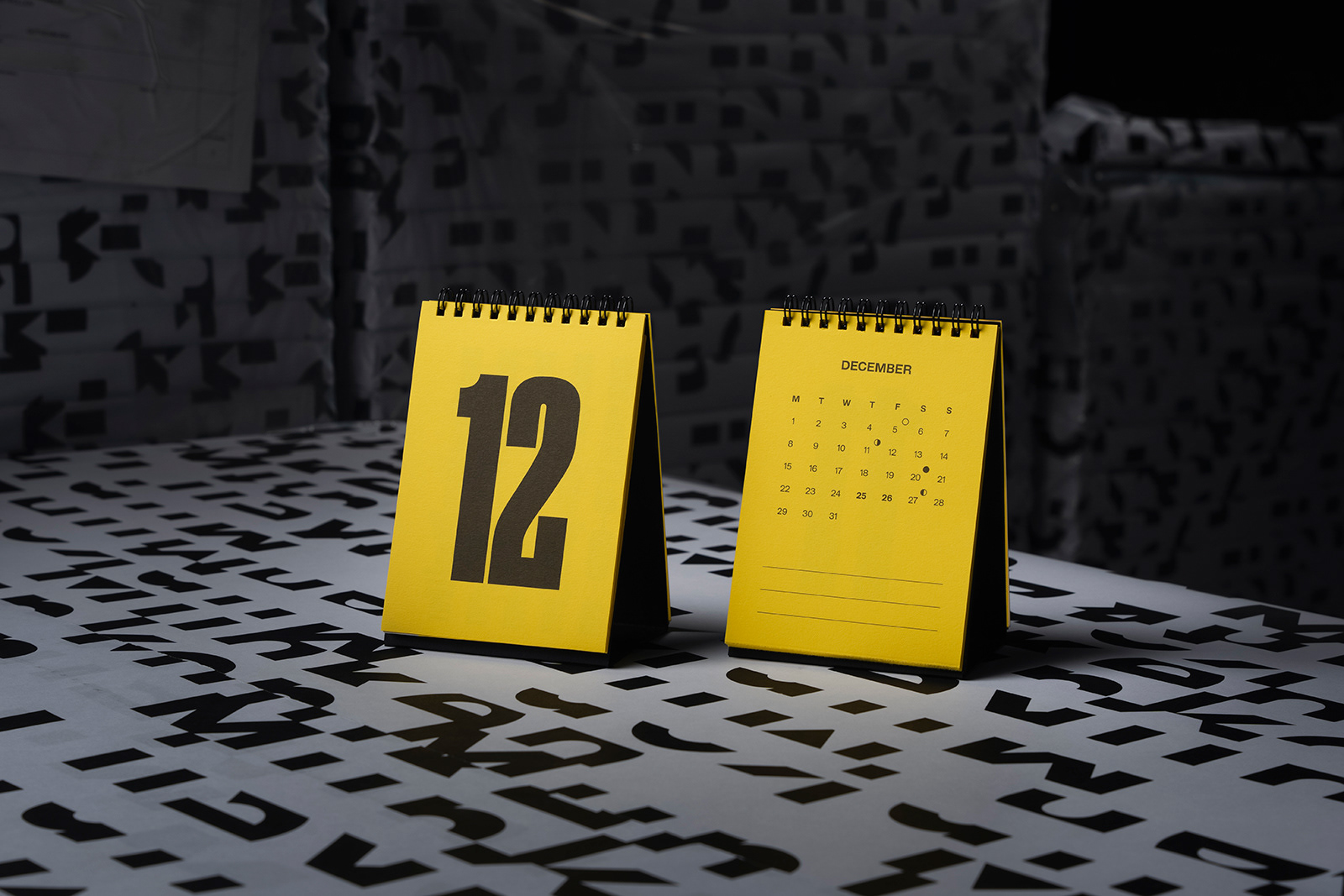For the paper, Colorplan Factory Yellow (G.F Smith) was chosen from Perrakis Papers, a shade of yellow which, combined with the black ink of the print, produces a really intense contrast that creates interest and makes the calendar “pop” in a space.