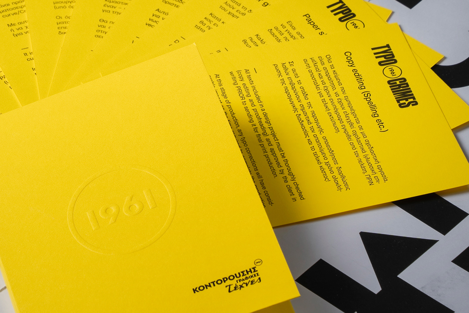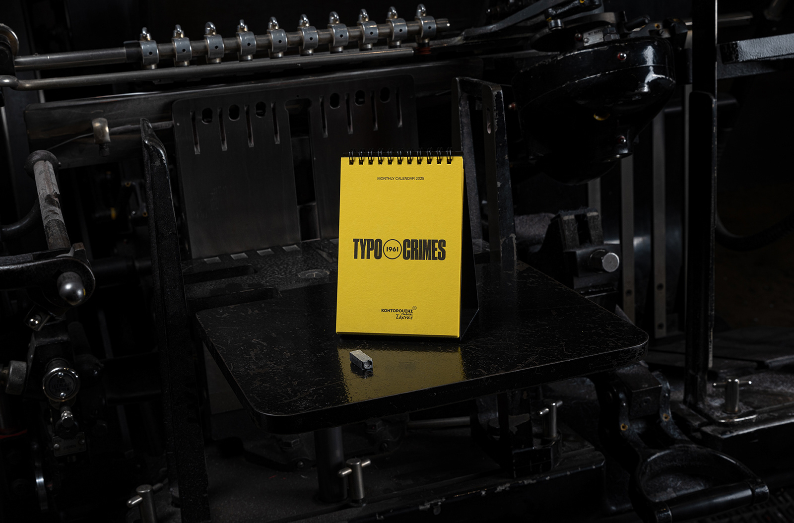 Τα ‘Typocrimes’ είναι ένα επιτραπέζιο μηνιαίο ημερολόγιο όπου αποτυπώνονται 12 κοινά «εγκλήματα» που συμβαίνουν κατά την τυπογραφική διαδικασία, το καθένα τυπωμένο σε ξεχωριστή καρτέλα Α6, με σκοπό να επιμορφώσουν και να προβληματίσουν, ώστε τα «εγκλήματα» αυτά να μην διαιωνίζονται!