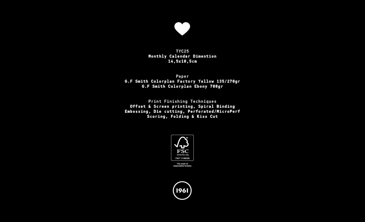 The monthly calendar TYC25 is in A6 dimension (10.5x14.8 cm) with spiral binding. The concept of this calendar was intended to be not just functional, but also to tell a story, to educate, and pass on the knowledge and experience of the Kontoroussis Bros., who have been active in the printing industry for more than 64 years.