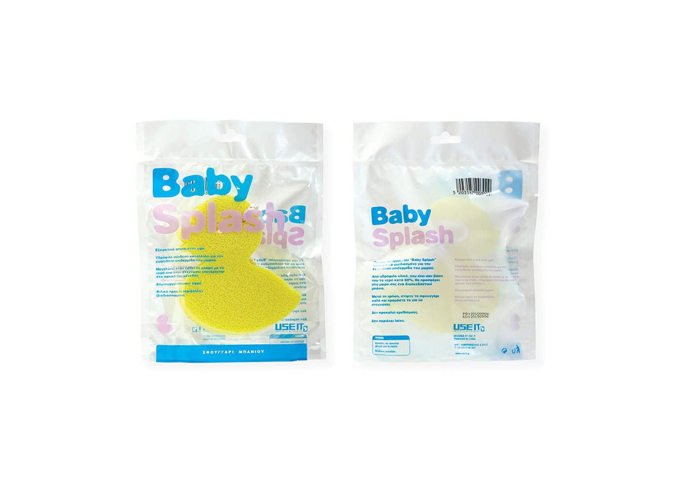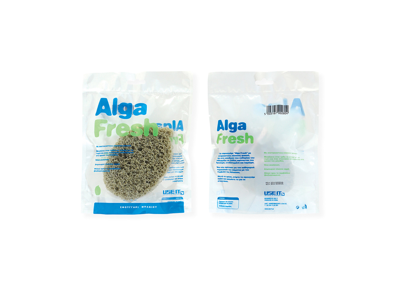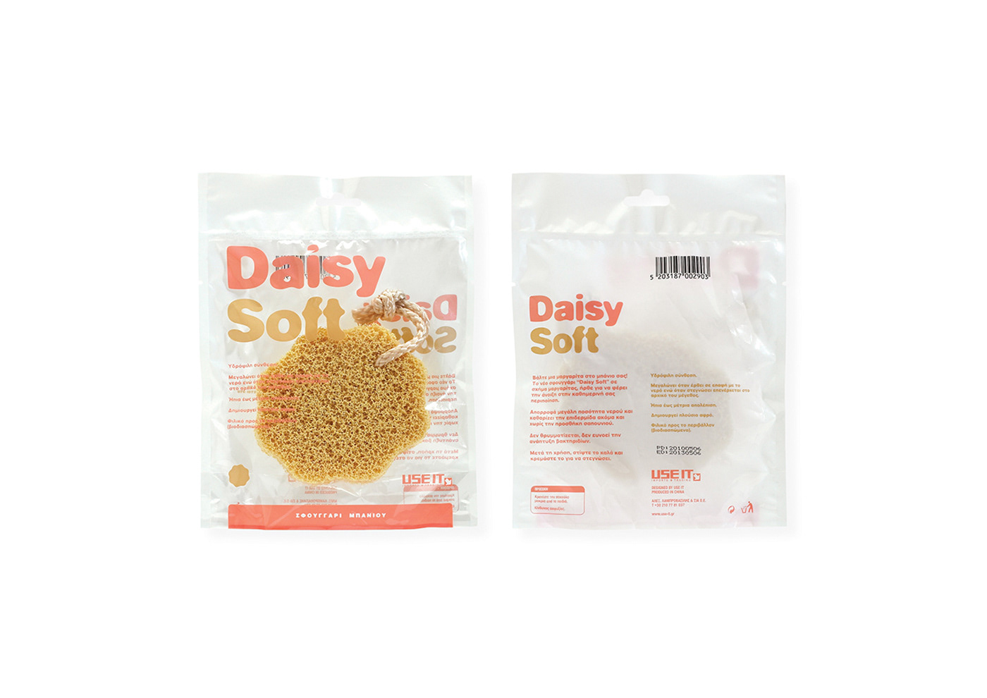 Three types of packaging for sponges: “Alga Fresh” with raw seaweed seeds, “Daisy Soft” in the shape of a daisy and “Baby Splash” especially for sensitive baby skin.
