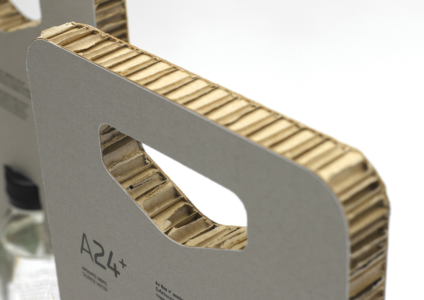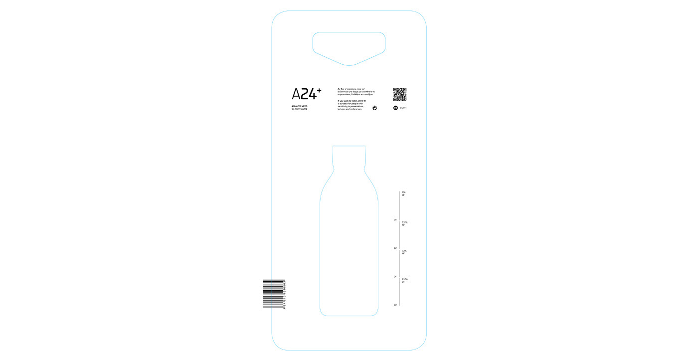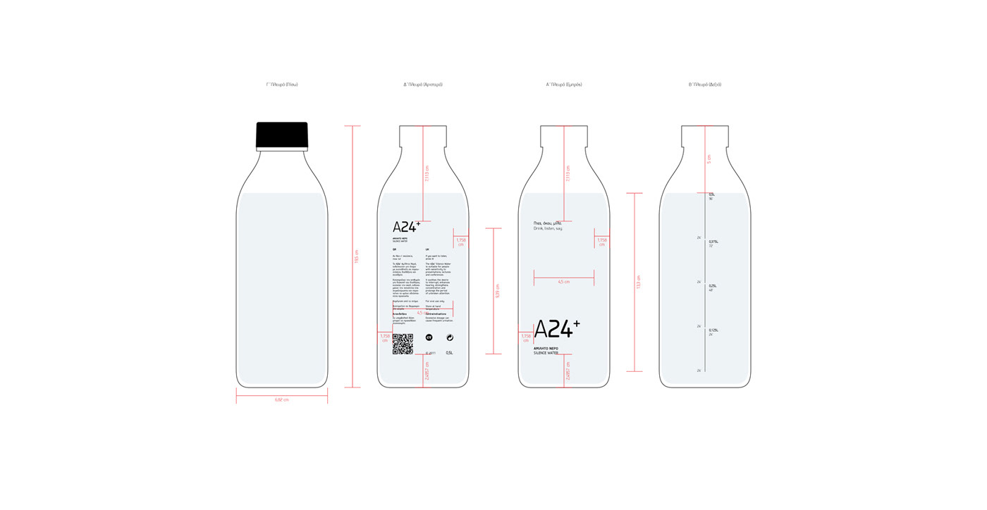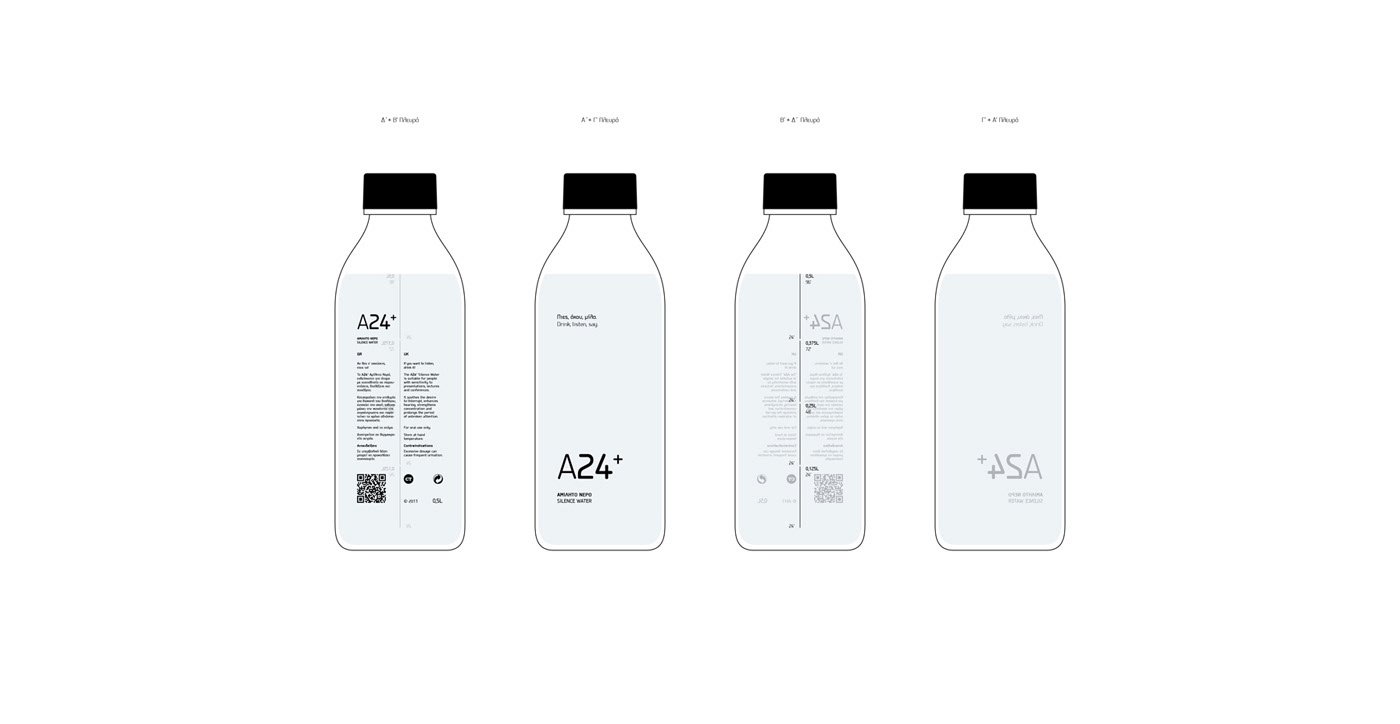 Το Α24+ σχεδιάστηκε σε γυάλινη φιάλη, στην οποία αποτυπώνεται δοσομετρητής με 4 δόσεις των 0,125L διάρκειας 24' η κάθε μία. Η ονομασία Α24+ προκύπτει από το συνδυασμό του Α, το οποίο είναι το αρχίγραμμα της λέξης «Αμίλητο» και του 24, που αναφέρεται στα λεπτά που διαρκεί η επίδραση τής κάθε δόσης.